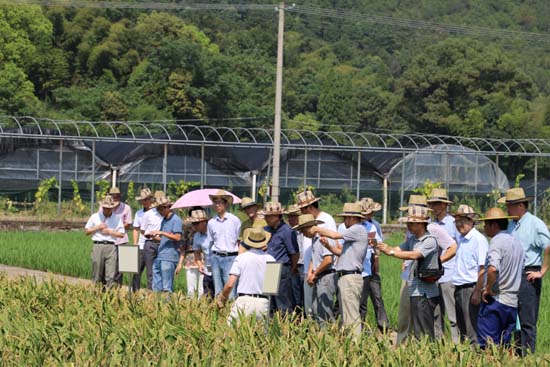 2015年7月28日,台州市农业局副局长程豪勇、市农技推广中心曾孝元站长组织全市各县市区农业局分管副局长、农技推广中心站长等30人参加台州市农科院选育品种台早733及早稻新品系现场观摩会,朱良其院长、潘晓飚副院长以及早稻课题主持人刘守坎所长陪同。首先,与会人员在我院小溪基地考察两个早稻新品系(台早14-122、台早14-126),充分肯定了台早14-122的丰产性和台早14-126的优良综合性状。随后,与会人员参观了位于上盘镇劳动村的台早733示范现场,一致认为该品种茎秆粗壮,抗倒性强,丰产性好,是一个穗、粒、重兼顾,配置合理,高产、中熟的早籼稻新品种,具有较好的推广应用前景。