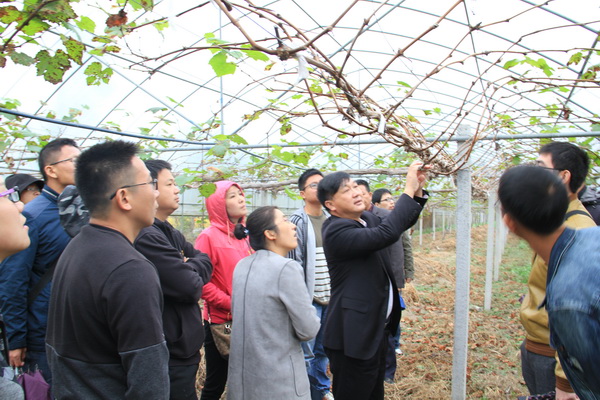第一处学习地是天台县九穗儿生态种植园,该种植园有葡萄种植面积810亩,以生产精品葡萄而闻名国内。2009年至今,种植的葡萄获全国葡萄评比金奖13个,省级金奖12个。目前,园内有葡萄优良品种醉金香、夏黑、寒香蜜、金手指等70余个,而且采摘期长,可以从夏摘到冬。在生产管理上严格按照“生态、安全、精品、高效”的经营理念,坚决不使用农药;形成了自己的一套生产技术——“数字化生态精致栽培”及国内首创“二次挂果”技术。在讨论会上,该企业总经理葛凌腾着重强调了经营理念是该公司能有此佳绩的关键,即使在损失巨大的情况下仍坚持其经营理念,葡萄生产保质保量的完成,正因为这样,才让其公司成为今年在杭州举行的G20峰会的唯一葡萄供应商。另外他还给我们介绍了他们是如何做到生态种植:一是除草从不用除草剂;二葡萄施肥所用的基肥都是羊粪、牛粪或蚕粪,对葡萄生产是安全可靠的;三是数字化管理;四是进行控产,一般亩产控制在2200斤,只有这样葡萄才能达到质优口感佳,即使销售价格偏贵,也会深受消费者的青睐。